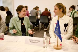 Das Highlight dieser Alumnifeier war die Simulation eines Sonderausschusses des Europäischen Parlaments, moderiert von Janis Fifka,Mitglied des Speakers-Pool-Teams EUROPE DIRECT der Europäischen Kommission. Der AStA-Stadtcampus verwandelte sich kurzerhand in das Europäische Parlament, den Rat der EU und die Europäische Kommission. In dieser lebhaften Simulation schlüpften die Teilnehmenden in die Rollen europäischer Entscheidungsträger*innen und diskutierten engagiert über das Spannungsfeld zwischen Nachhaltigkeit und Sicherheit. Nach intensiven Verhandlungen zeigte sich: Alle Gesetzesvorschläge der Kommission wurden mit einigen Änderungen pünktlich zur Eröffnung des Buffets angenommen.